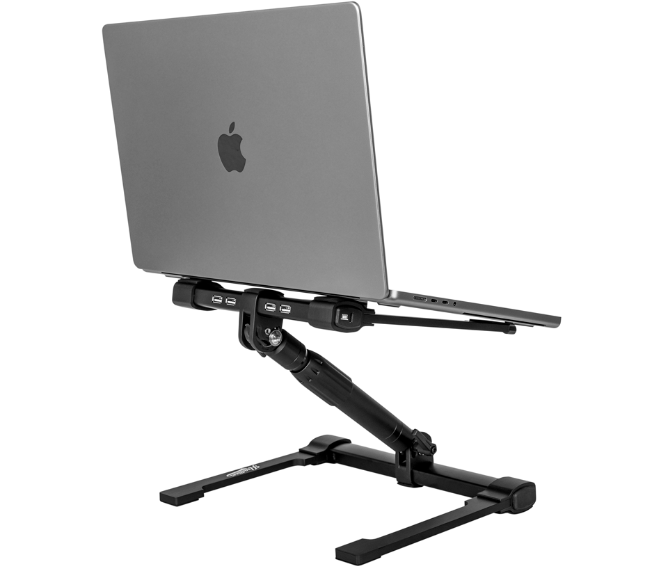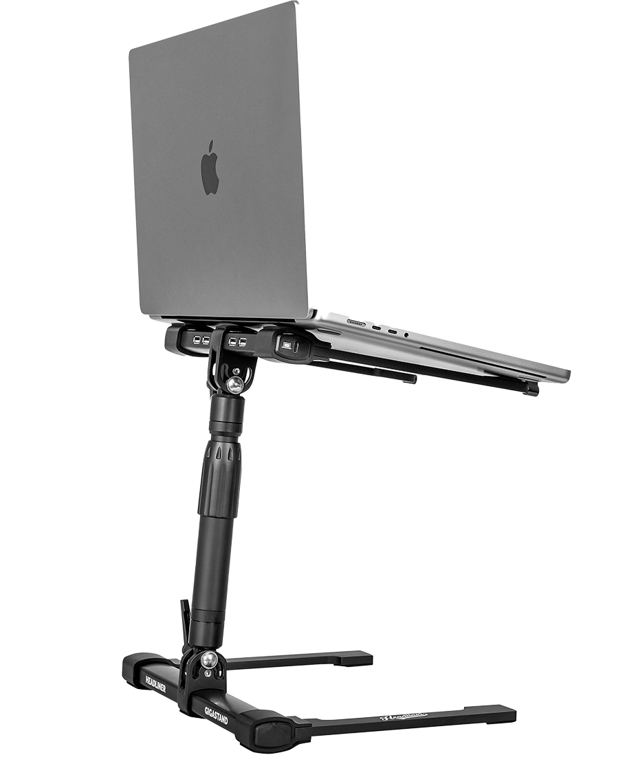 Der Headliner Gigastand USB ist ein vollständig verstellbarer Laptop-Ständer mit integriertem Hochgeschwindigkeits-USB-Hub. Entwickelt für DJs, Musiker, Performer und Kreative kombiniert dieses 2-in-1-Gerät zwei wesentliche Teile deines Setups und spart Platz auf deiner Workstation und in deiner Tasche.